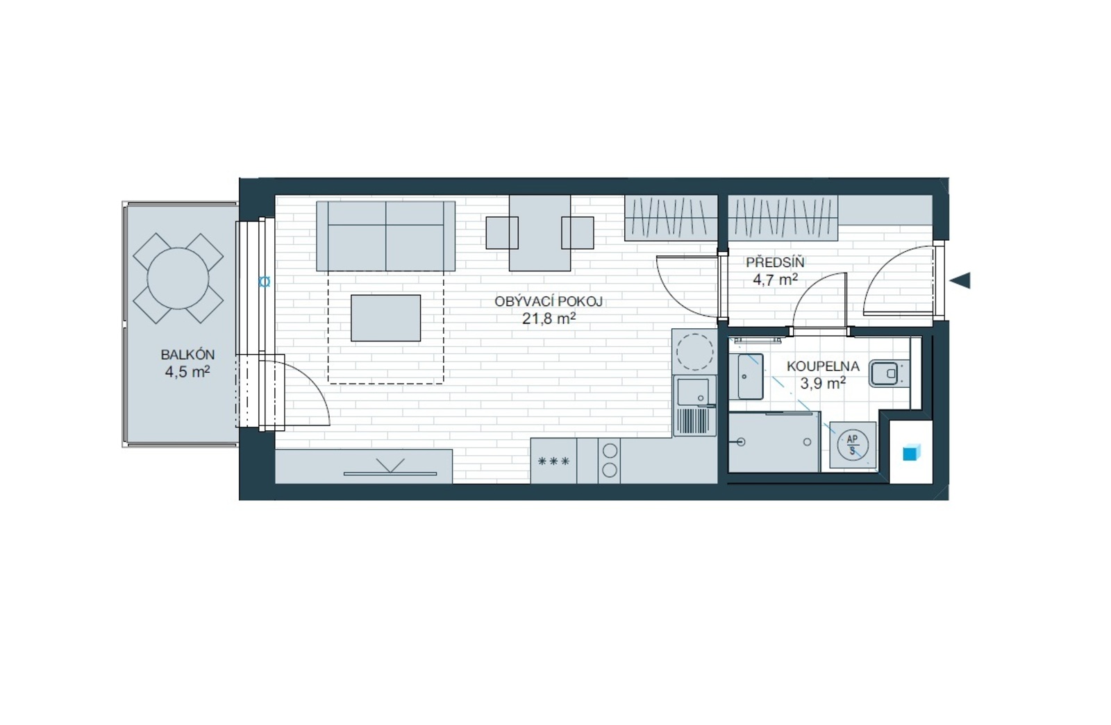 A2.307 o velikosti 1r+kk (byt 32,5 m2 + balkón 5 m2), který se nachází