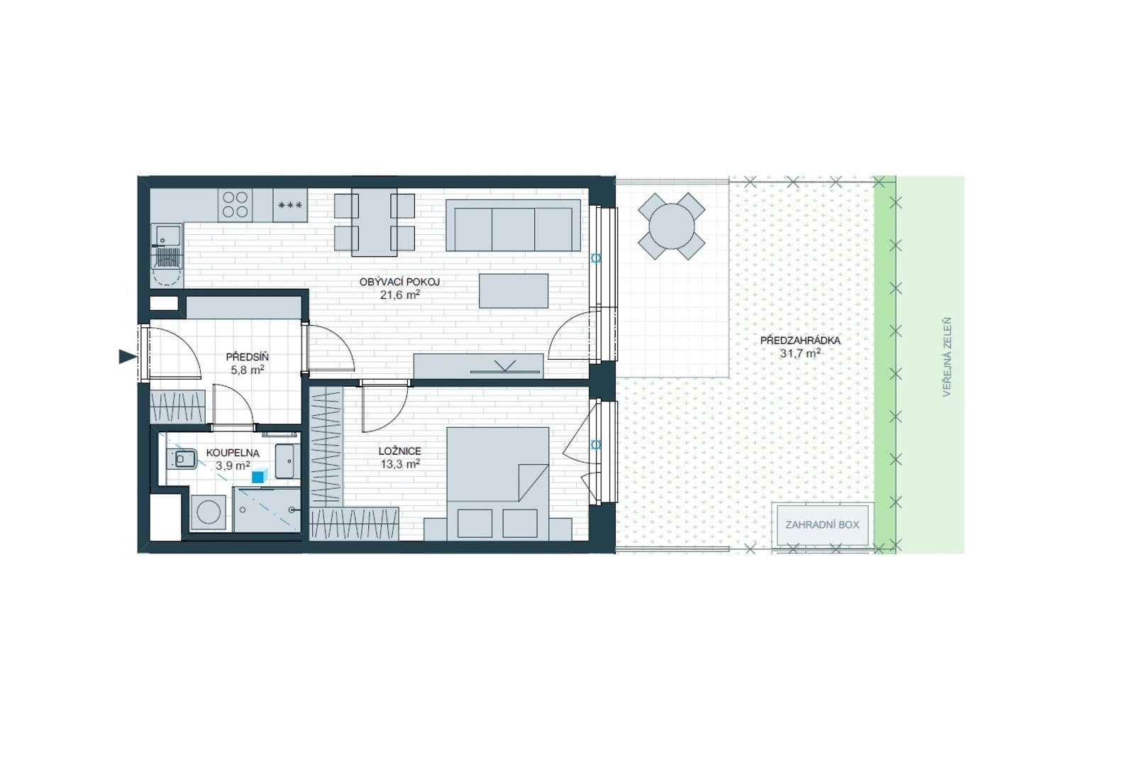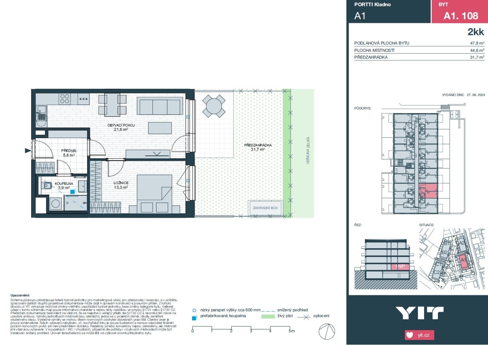 A1.108 o velikosti 2r+kk, (byt 47,9 m2 + zahrádka 29 m2), který se