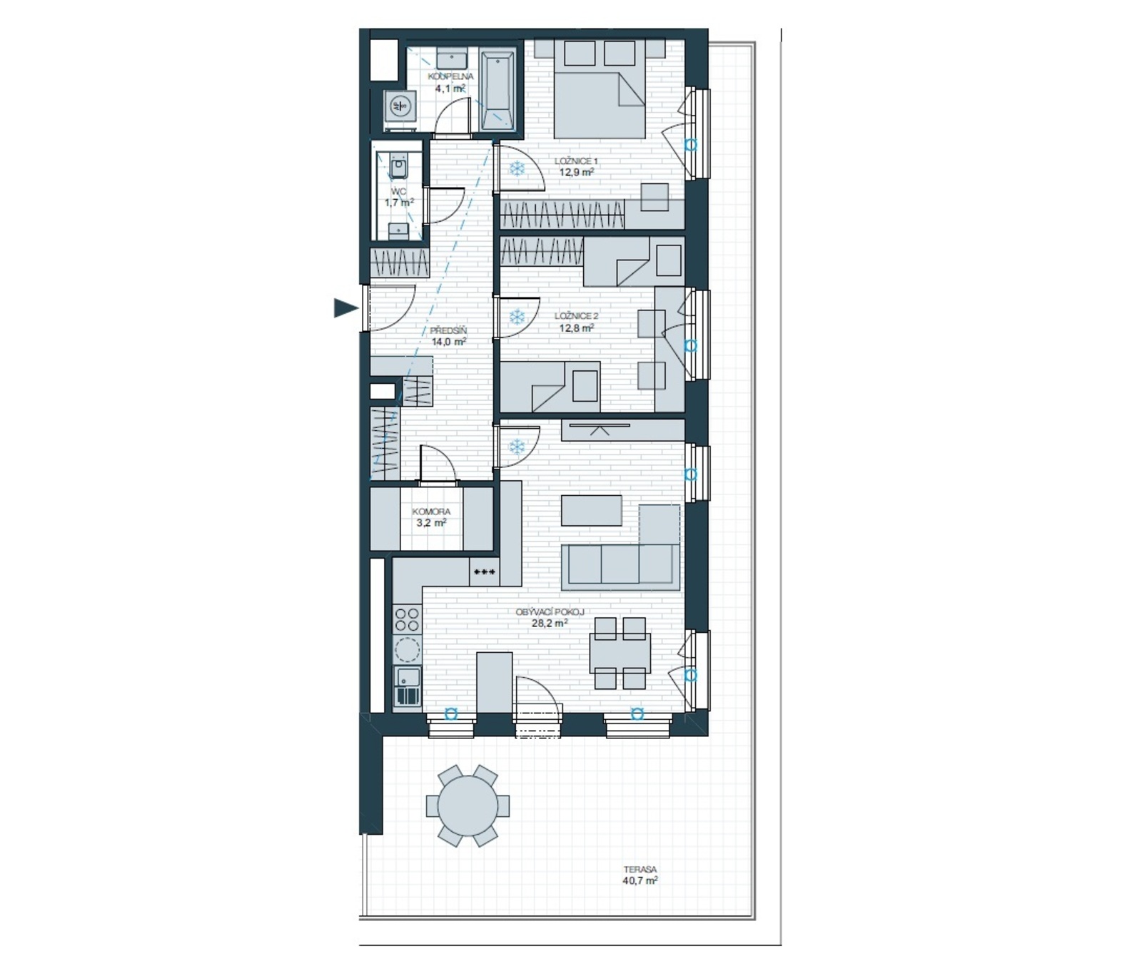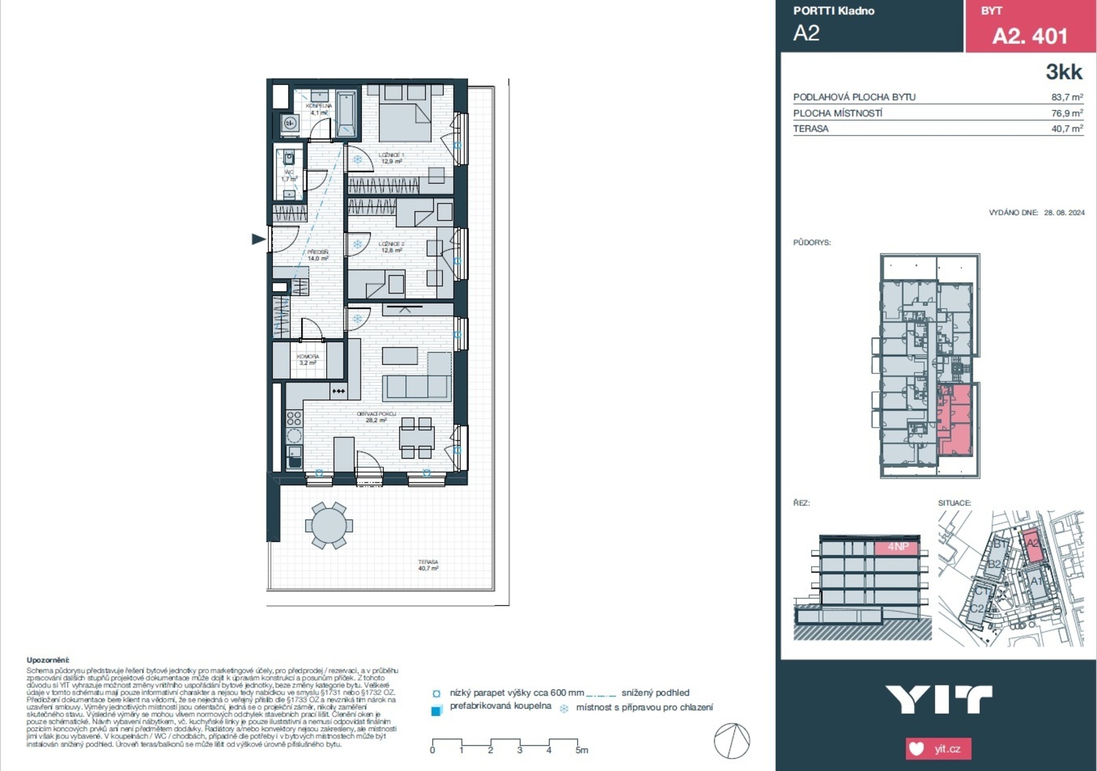 A2.401 o velikosti 3r+kk, (byt 83,9 m2 + terasa 41 m2), který se nachází